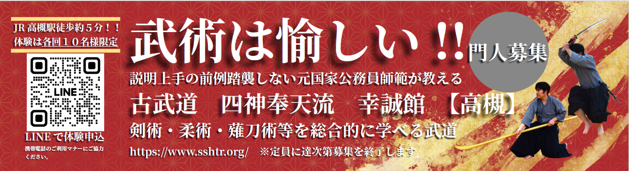 剣術・居合術・棒術・薙刀術等の武器術や徒手の戦闘術である柔術等の日本古来の古武道・古武術とそれを使う人間の道徳(人間形成)を大阪高槻市等で稽古する令和に創始された古くて新しい総合武道です。